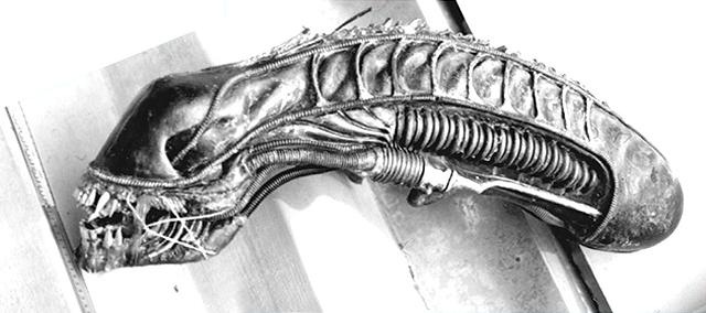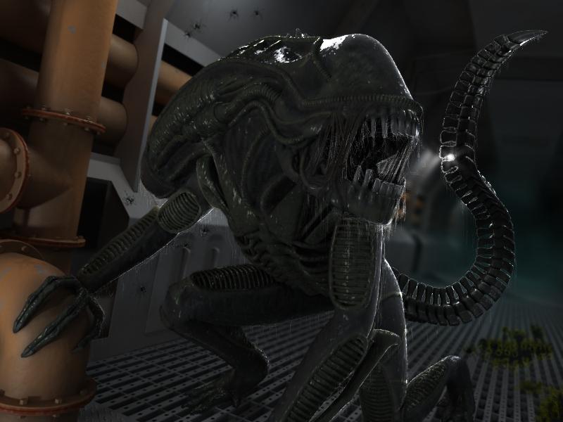 Alien is polygonally modeled and meshmoothed. Scene is rendered with VRay. Some details are added in 2d post-production.