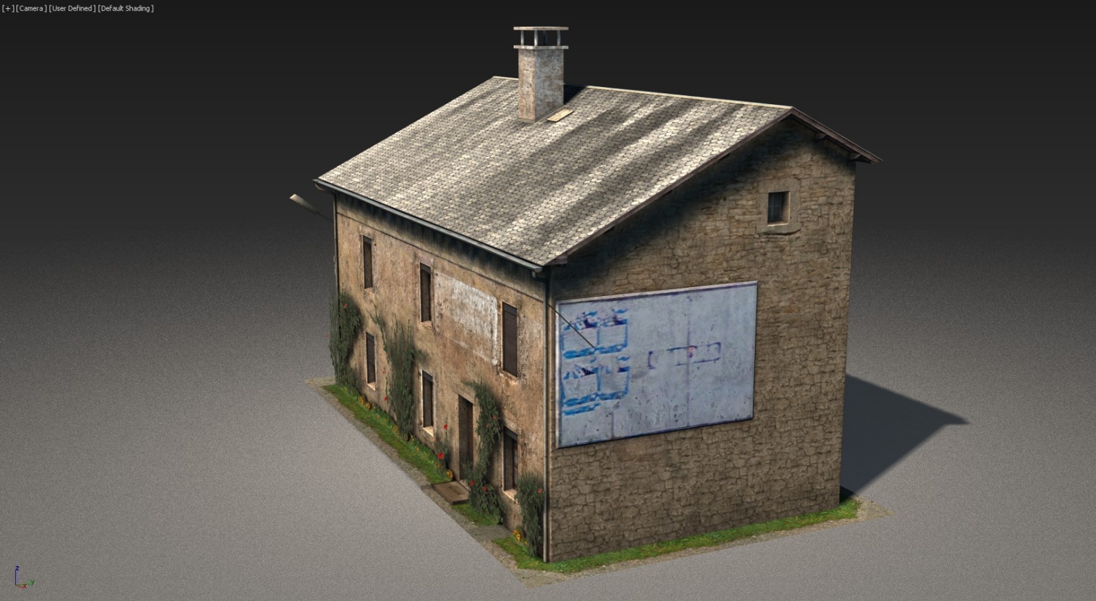 Low-poly model (2,000 traingles) of a house based on photos from Google Maps street view. 1024x1024 diffuse texture with alpha channel.