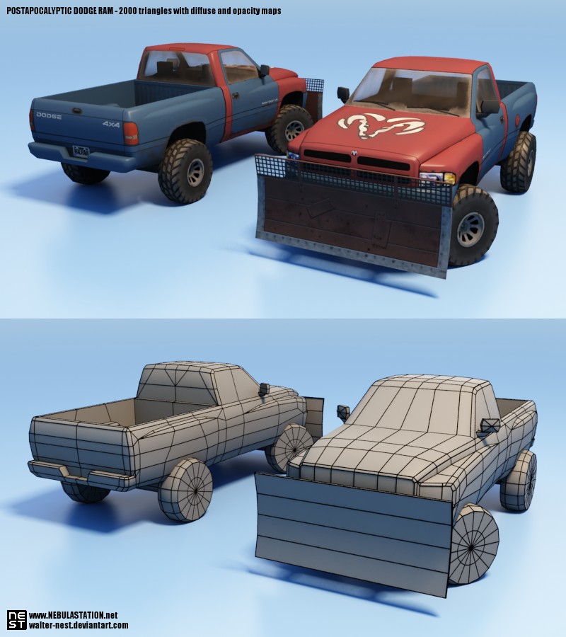 Model from low-poly modeling contest of "cars suitable for use in Carmageddon". 2000 triangles budget, 1024x1024 diffuse and opacity textures.